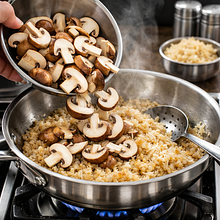 Dodaj pokrojone pieczarki do patelni i zwiększ ogień do średnio-wysokiego. Smaż bez przykrycia 8-10 minut, mieszając co 1-2 minuty, aż większość uwolnionej wody odparuje, a pieczarki zaczną się rumienić. Na tym etapie dodaj 2 g pieprzu czarnego i 2 g tymianku (1 łyżeczka). Spróbuj — grzyby powinny mieć intensywny aromat i lekko złociste brzegi.