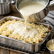 Wylej równomiernie kremowy sos na wierzch zapiekanki. Posyp pozostałe 75 g tartego sera i, jeśli używasz, posiekane orzechy włoskie (50 g) dla chrupkości. Wstaw do nagrzanego piekarnika i zapiekaj 25-30 minut, aż wierzch będzie złocisty, ser się roztopi i zacznie lekko bąbelkować. Po upieczeniu wyjmij i odstaw na 10 minut, aby danie 'doszło' — sos nieco stężeje i łatwiej będzie porcjować.