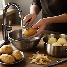 Użyj ostrej obieraczki do ziemniaków i stabilnej deski do krojenia. Jeśli masz mandolinę, ustaw grubość na ok. 2–3 mm dla równomiernego pieczenia; jeśli nie, użyj ostrego noża i kroj plastry równomiernej grubości.