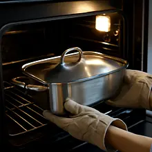 Wstaw naczynie do nagrzanego piekarnika na środkową półkę. Piecz zasłonięte 30 minut w 190°C. Po 30 minutach zdejmij folię i piecz kolejne 20–25 minut, aż wierzch będzie złocisty, ser bąbelkować, a nóż włożony w środek będzie łatwo wchodził w ziemniaki (sprawdzaj w kilku miejscach). Całkowity czas pieczenia: 50–55 minut (jeśli nie blanszowałeś ziemniaków wcześniej). Jeśli plastry były blanszowane, skróć pieczenie pod przykryciem do 20–25 minut i bez przykrycia 15–20 minut.