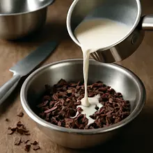 Przygotuj polewę: posiekaj 150 g gorzkiej czekolady i przełóż do miseczki. Podgrzej 60 ml śmietanki kremówki (możesz użyć z przygotowanych wcześniej 400 ml, odlewając przed ubijaniem) prawie do wrzenia (małe bąbelki przy krawędzi). Zalej czekoladę gorącą śmietaną, odczekaj 30–40 sekund, a następnie mieszaj delikatnie aż do uzyskania gładkiej, błyszczącej masy. Jeśli chcesz połysk, dodaj 10 g masła i wymieszaj.