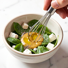 Użyj małej miseczki i trzepaczki lub widelca; energiczne mieszanie pozwala uzyskać gładki dressing. Jeśli dressing się rozwarstwi, dodaj 1/2 łyżeczki musztardy i wymieszaj ponownie.