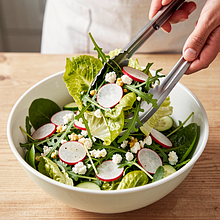 Użyj dwóch dużych łyżek lub szczypiec do sałatek. Mieszaj krótko i delikatnie: 2–3 ruchy wystarczą, aby nie połamać liści i nie zrobić papki.