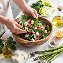 Do dużej miski włóż osuszone liście szpinaku, sałaty masłowej i szczaw. Dodaj ciepły (lub schłodzony) rabarbar, ewentualnie przygotowane szparagi. Rozsyp kawałki fety równomiernie. Polej 2/3 przygotowanego dressingu i delikatnie wymieszaj — użyj dwóch dużych łyżek lub chwytaczy do sałaty: podnoś składniki od dołu i składaj na wierzch, by nie rozgnieść liści. Jeśli sałatka wydaje się zbyt sucha, dodaj resztę dressingu.