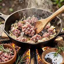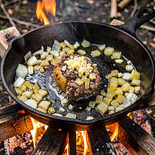 Tradycyjne ziemniaki faszerowane mięsem przygotowane na ognisku — rustykalne, sycące danie z polskim charakterem, łączące proste składniki: ziemniak, wieprzowina, cebula, czosnek i majeranek. Farsz jest najpierw podsmażany, łączony z wydrążonym miąższem ziemniaczanym i zapiekany w folii w żarze ogniska, dzięki czemu otrzymujemy soczyste wnętrze o lekko wędzonym aromacie i chrupiącej skórce. To danie idealne na majówkę, ognisko z rodziną lub jako treściwy obiad na świeżym powietrzu. Podawać z kwaśną śmietaną, natką pietruszki i ewentualnie szczawiem lub tartym serem żółtym jako opcjonalnymi dodatkami; wizualnie efektowne — złoto-brązowa skórka, kremowy farsz z widocznymi kawałkami mięsa i zielonym akcentem natki.