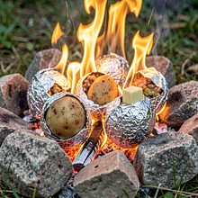 Zawiń ciasno każdy ziemniak w folię (dwie warstwy). Umieść je w żarze ogniska lub na granitowych kamieniach obok ognia, nie bezpośrednio w płomieniu. Piecz przez 20–30 minut, obracając co 8–10 minut, aby równomiernie się zapiekły. Ziemniak jest gotowy, gdy skórka jest jędrna i lekko przypieczona, a środek po nakłuciu jest gorący i farsz lekko bulgocze.