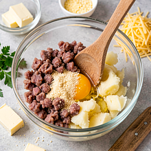 Do miski z podsmażonym mięsem i odłożonym miąższem ziemniaczanym dodaj bułkę tartą i jedno jajko, a także pokrojoną natkę pietruszki. Wymieszaj dokładnie — farsz powinien być wilgotny, ale nie płynny. Na końcu wmieszaj masło w kawałkach, które rozpuści się pod wpływem ciepła farszu i doda kremowości. Jeśli używasz sera żółtego (opcjonalnie), dodaj teraz starty ser i wymieszaj.