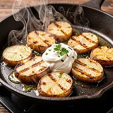 W Polsce ziemniak stał się podstawą kuchni od XVIII wieku; młode ziemniaki z masłem i koperkiem to klasyczne, regionalne smaki wiosenne — tutaj dodaliśmy grill i kwaśną śmietanę jako nowoczesny twist.