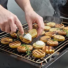 Grilluj ziemniaki 4–6 minut z każdej strony (łącznie 12–16 minut), aż skórka stanie się złocista i chrupiąca, a środek miękki — sprawdzisz to wbijając mały nóż: powinien wchodzić bez oporu. Obracaj co 3–4 minuty, żeby uzyskać równomierne przyrumienienie.