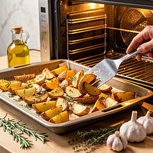 Rozłóż ziemniaki na przygotowanej blasze w jednej warstwie, skórką do dołu jeżeli mają. Piecz w nagrzanym piekarniku 30-40 minut. Po 20 minutach użyj szerokiej łopatki, aby delikatnie przewrócić ziemniaki i rozłożyć je równomiernie — dzięki temu zarumienią się z każdej strony. Piecz do momentu, gdy skórka będzie złocista i chrupiąca, a środek miękki.