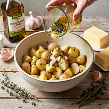Tradycyjne polskie ziemniaki pieczone z aromatycznym czosnkiem i mieszanką ziół — chrupiące z zewnątrz, miękkie w środku. Danie inspirowane kuchnią regionalną Polski, przygotowane z prostych składników sklepowych: młode ziemniaki, czosnek, olej rzepakowy i suszony tymianek. Świetne jako danie główne z prostą surówką lub jako dodatek do pieczonego mięsa. Wizualnie apetyczne: złocista skórka, zielone listki pietruszki i opcjonalna skórka cytryny dla świeżości. Idealne na rodzinny obiad i majówkowe spotkania.