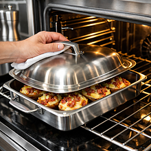 Przykryj naczynie folią aluminiową lub przykrywką i wstaw do nagrzanego piekarnika. Piecz przykryte 25 minut w 200°C. Po 25 minutach ostrożnie zdejmij folię i piecz bez przykrycia kolejne 10–15 minut, aż wierzch będzie złoty, ser się rozpuści, a boki zaczną bulgotać. Sprawdź widelcem: ziemniaki powinny być miękkie i łatwo w nie wchodzić.
