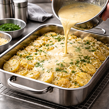 Kremowe ziemniaki zapiekane z serem żółtym i dużą ilością świeżego koperku to polska, domowa propozycja obiadowa — treściwa, pachnąca masłem i ziołami, o złocistej, ciągnącej się warstwie sera na wierzchu. Danie łączy prostotę składników (ziemniak, cebula, śmietana, ser) z technikami gwarantującymi aksamitną strukturę: cienkie plasterki ziemniaka, podsmażona cebula i śmietankowo-jajeczna masa, która spaja warstwy. Świetnie pasuje do kwaśnej surówki z białej kapusty lub prostych kiszonych ogórków; jako danie główne z powodzeniem zaspokoi głód 3–4 osób. Wizualnie przyciąga złocistą, lekko chrupiącą skorupką sera i zielonym akcentem świeżego koperku. Przepis zawiera dokładne instrukcje dla początkującego kucharza, alternatywy składników oraz wskazówki dotyczące zapiekania i przechowywania.