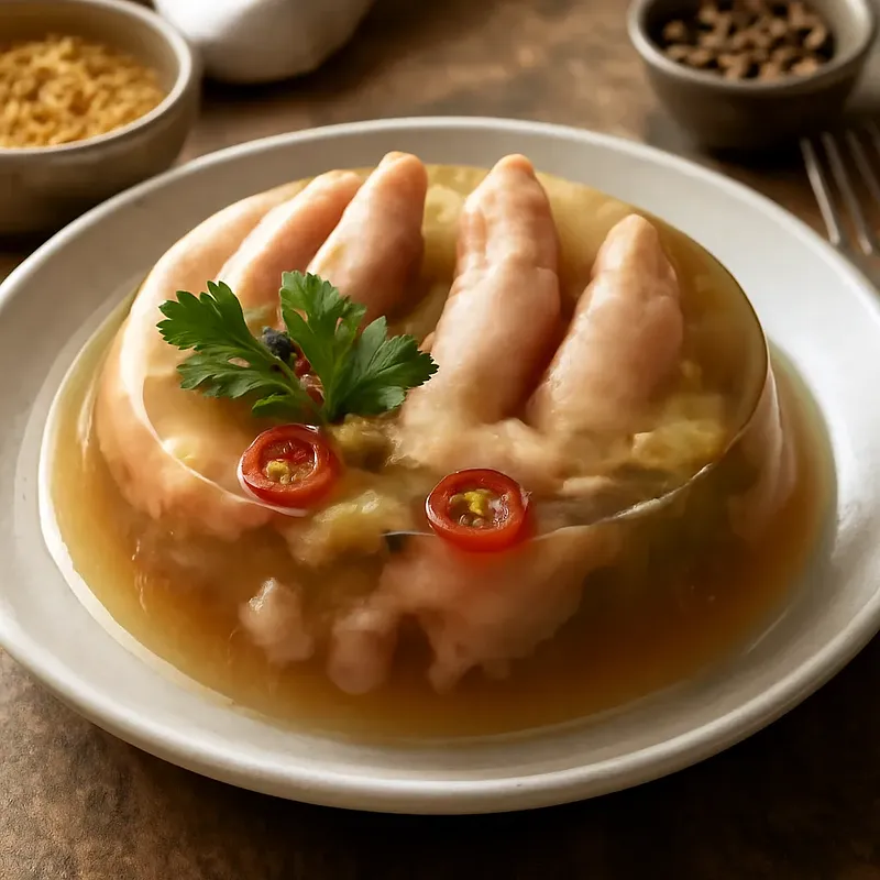 Tradycyjne zimne nóżki to polska przekąska z bogatego, klarownego bulionu mięsno-kostnego, który po schłodzeniu tworzy naturalną galaretę. Przygotowuje się je z nóżek wieprzowych (bogatych w kolagen) i kawałka mięsa dla smaku, z dodatkiem warzyw i przypraw. Danie ma wyrazisty, mięsno-korzenny smak, przejrzystą, złocistą galaretę i apetyczne kawałki mięsa oraz plasterki marchwi w środku. Zimne nóżki świetnie sprawdzają się jako przekąska na Wigilię, stół świąteczny lub jako dodatek do kanapek; podaje się je schłodzone, często z chrzanem lub octem i świeżą pietruszką. Wizualnie są atrakcyjne — przejrzysta galareta odsłania kawałki mięsa, warzyw i przypraw, a podana na jasnym półmisku wygląda elegancko i rustykalnie.