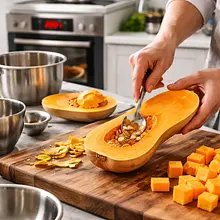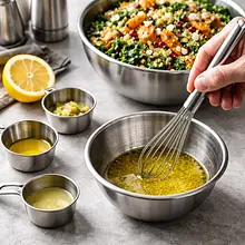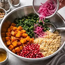 Opłucz 160 g sucha komosę pod zimną wodą w drobnym sitku przez 30-60 sekund, pocierając ziarenka palcami — usuniesz w ten sposób naturalną gorzką powłokę (saponiny). Przełóż opłukaną komosę do średniego garnka i dodaj 320 ml wody (stosunek 1:2 wagowy). Doprowadź do wrzenia na średnio-wysokim ogniu, następnie zmniejsz ogień do małego i gotuj pod przykryciem przez 12-15 minut, aż ziarna staną się przezroczyste, a z każdego ziarna wystąpi mała „obręcz” (widoczna biała nitka). Po ugotowaniu odstaw garnek bez zdejmowania pokrywki na 5 minut, a następnie spulchnij widelcem i odstaw do ostygnięcia.