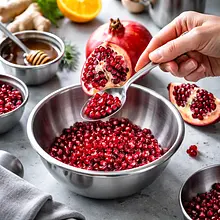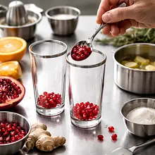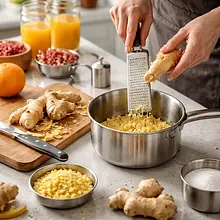 Przygotuj syrop imbirowy: obierz imbir i drobno go posiekaj lub zetrzyj na tarce o drobnych oczkach. W małym rondelku połącz 100 g cukru, 100 ml wody i starty imbir (20 g). Postaw na średnim ogniu i podgrzewaj, mieszając drewnianą łyżką, aż cukier całkowicie się rozpuści (ok. 2–3 minuty). Zmniejsz ogień i gotuj delikatnie 2–3 minuty, aż syrop stanie się lekko gęsty i zacznie lekko parować. Zestaw z ognia i odstaw na 5 minut, by aromaty się przegryzły. Przelej przez drobne sito bezpośrednio do dzbanka, lekko dociskając imbir łyżką, aby wydobyć aromat; wyrzuć resztki imbiru.