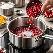 Przygotuj syrop: umieść 220 g pestek granatu (ok. dwie trzecie przygotowanych pestek) w średnim rondlu, dodaj 200 g cukru i 150 ml wody. Użyj drewnianej łyżki, aby lekko rozgnieść pestki na dnie garnka — nie muszą być całkowicie rozdrobnione, wystarczy, żeby puściły sok. Postaw rondel na średnio-niskim ogniu, doprowadź do delikatnego wrzenia, a następnie gotuj przez 10–12 minut, mieszając co minutę, aż cukier całkowicie się rozpuści, a mieszanka zgęstnieje i nabierze intensywnego, głębokiego koloru. Po ugotowaniu zdejmij z ognia, przecedź przez drobne sito do czystej miski, dociskając łyżką skórki i nasion, aby wydobyć jak najwięcej soku. Dodaj 20 g soku z cytryny do przecedzonego syropu i wymieszaj. Odstaw do ostudzenia.