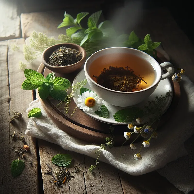 Ziołowa herbata to delikatny, aromatyczny napój przygotowany na bazie suszonych ziół: mięty, melisy i kwiatów lipy, z dodatkiem suszonego imbiru. Jest to napój bezkofeinowy, często serwowany w Polsce zimą i podczas świątecznych spotkań, takich jak Wigilia, ponieważ łagodzi przeziębienia, rozgrzewa i koi żołądek. Napar ma złocisto-bursztynowy kolor, świeży zapach mięty i cytrusową nutę melisy z subtelnym, korzennym akcentem imbiru. Podawać można go w eleganckich dzbankach lub porcelanowych filiżankach, ewentualnie z plasterkiem cytryny i łyżeczką miodu. Wizualnie dobrze komponuje się z gałązką świeżej mięty lub laską cynamonu, a smak można delikatnie wzbogacić cynamonem czy miodem według gustu.