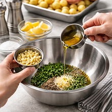 Przygotuj marynatę: w dużej misce połącz olej rzepakowy (45 g), przeciśnięty czosnek (15 g), startą skórkę z cytryny (z całej cytryny) oraz sok wyciśnięty z połowy cytryny (ok. 30 g soku). Dodaj posiekane listki tymianku i rozmarynu (odłączone od łodyżek), paprykę słodką (5 g), połowę soli (2-3 g) i połowę pieprzu (1 g). Mieszaj widelcem lub łyżką aż składniki się połączą i powstanie jednolita emulsja.