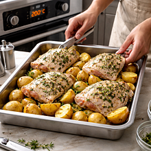 Rozgrzej piekarnik do 200°C (jeśli używasz termoobiegu, ustaw na 180°C). Ułóż udka skórą do góry na blasze z odległością ok. 3 cm między nimi, tak by powietrze cyrkulowało. Obok rozłóż ziemniaki w jednej warstwie, nie zachodząc na siebie. Wstaw do nagrzanego piekarnika i piecz przez 40 minut. Po 20 minutach otwórz piekarnik i delikatnie obróć ziemniaki, aby się równomiernie zrumieniły; sprawdź również czy skórka kurczaka nie rumieni się zbyt szybko — jeśli tak, przykryj luźno folią aluminiową na ostatnie 10 minut.