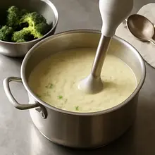 Wyłącz ogień. Używając blendera ręcznego (immersion blender), dokładnie zmiksuj zupę na gładki krem — prowadź blender od dna garnka ku górze, aby równomiernie rozdrobnić ziemniaki i brokuły. Blenduj 1-2 minuty, aż masa będzie całkowicie gładka i bez grudek. Jeśli nie masz blendera ręcznego, przelej zupę partiami do blendera kielichowego (wypełniaj maksymalnie do 2/3 pojemności) i miksuj krótkimi pulsami, pozostawiając otwór w pokrywce, aby para mogła uciekać (przykryj otwór ściereczką).