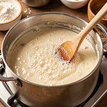 Do garnka z zasmażką wlej stopniowo bulion warzywny (1000 ml), mieszając trzepaczką, aby rozpuścić zasmażkę i uniknąć grudek. Doprowadź do wrzenia, następnie dodaj pokrojone ziemniaki. Gotuj na średnim ogniu 12–15 minut, aż ziemniaki będą miękkie — sprawdź widelcem.