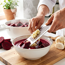 Gdy buraki są ugotowane (z kroków wcześniejszych), odcedź je, ostudź na sitku lub desce przez 5–10 minut, a następnie obierz skórkę (łatwo schodzi po ugotowaniu). Pokrój buraki w kostkę lub zetrzyj na grubych oczkach tarki — kawałki mają być wyczuwalne w zupie. Zetrzyj świeży chrzan na drobnych oczkach tarki lub użyj specjalnej tarki mikroplane — uzyskasz około 50 g tartego chrzanu. Chrzan jest ostry, pracuj z nim szybko, unikaj wdychania oparów.