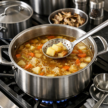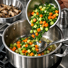 Zmniejsz ogień do średnio-niskiego i gotuj warzywa 20-25 minut, aż ziemniaki będą miękkie (sprawdź widelcem — widelec powinien wchodzić gładko). Po 10 minutach gotowania dodaj kapustę kiszoną i gotuj dalej. Po 15-20 minutach od dodania kapusty spróbuj wywar — kapusta ma się rozpaść na jędrne kawałki, a smak powinien być zrównoważony między słodyczą warzyw a kwaśnością kapusty.