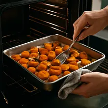 Nagrzej piekarnik do 200°C (góra-dół). Dynię przekrój na pół, wyjmij łyżką nasiona i włókna. Obierz dynię nożem lub obieraczką, a następnie pokrój miąższ w kawałki o boku około 3-4 cm (równe kawałki pieką się równomiernie). W dużej misce wymieszaj kawałki dyni z 15 g oliwy z oliwek i 1 g soli (jedna szczypta). Rozłóż równomiernie na blasze wyłożonej papierem do pieczenia w jednej warstwie, pozostawiając niewielkie odstępy.