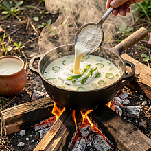 Tradycyjna polska zupa ogórkowa przerobiona na wersję ogniskową — aromatyczna, kwaśno-kremowa, ze świeżą dymką i koperkiem. Danie łączy klasyczny, lekko kwaskowy smak ogórków kiszonych z dymką dodającą wiosennej świeżości oraz delikatną nuta dymu z ogniska (można ją wzmocnić kawałkiem wędzonej kiełbasy). Idealna na majówkę lub rodzinne spotkanie na świeżym powietrzu; można podawać z ciemnym chlebem, ziemniakami lub jako lekki posiłek po długim spacerze. Zupa ma kremową konsystencję po zabieleniu śmietaną i jest puszysta od koperku — efektownie wygląda w żeliwnym kociołku podanym prosto z ognia.