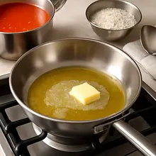 W międzyczasie rozgrzej na średniej patelni 15 g oleju i 30 g masła. Gdy tłuszcz się rozpuści i lekko spieni (ok. 30 sekund), dodaj posiekaną cebulę i smaż 4-5 minut, często mieszając, aż stanie się szklista i miękka. Dodaj startą marchew i smaż kolejne 3 minuty. Na końcu dodaj posiekany czosnek i smaż 30-40 sekund, aż uwolni aromat — nie rumień go zbyt mocno, bo stanie się gorzki.