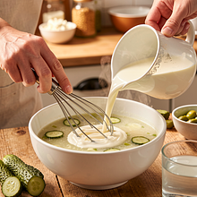 Aromatyczna, lekka zupa z młodej kapusty z dodatkiem ogórka kiszonego — klasyka polskiej kuchni w wiosennej odsłonie. Dzięki młodej kapuście zupa jest delikatna i jasnozielona, a ogórek kiszony wnosi przyjemną kwaśną nutę i chrupkość, która ożywia strukturę. Danie jest sycące dzięki ziemniakom i można je zabielić śmietaną dla kremowej konsystencji lub zostawić klarowną dla lżejszej wersji. To zupa domowa, popularna w regionach wiejskich, świetnie pasuje do ciemnego chleba, pieczonego boczku (wersja rustykalna) lub lekkiej wędzonej ryby. Idealna na wiosenne obiady, gdy dostępna jest młoda kapusta i świeże warzywa; wygląda apetycznie w misce z posypanym koperkiem i plasterkiem ogórka kiszonego.